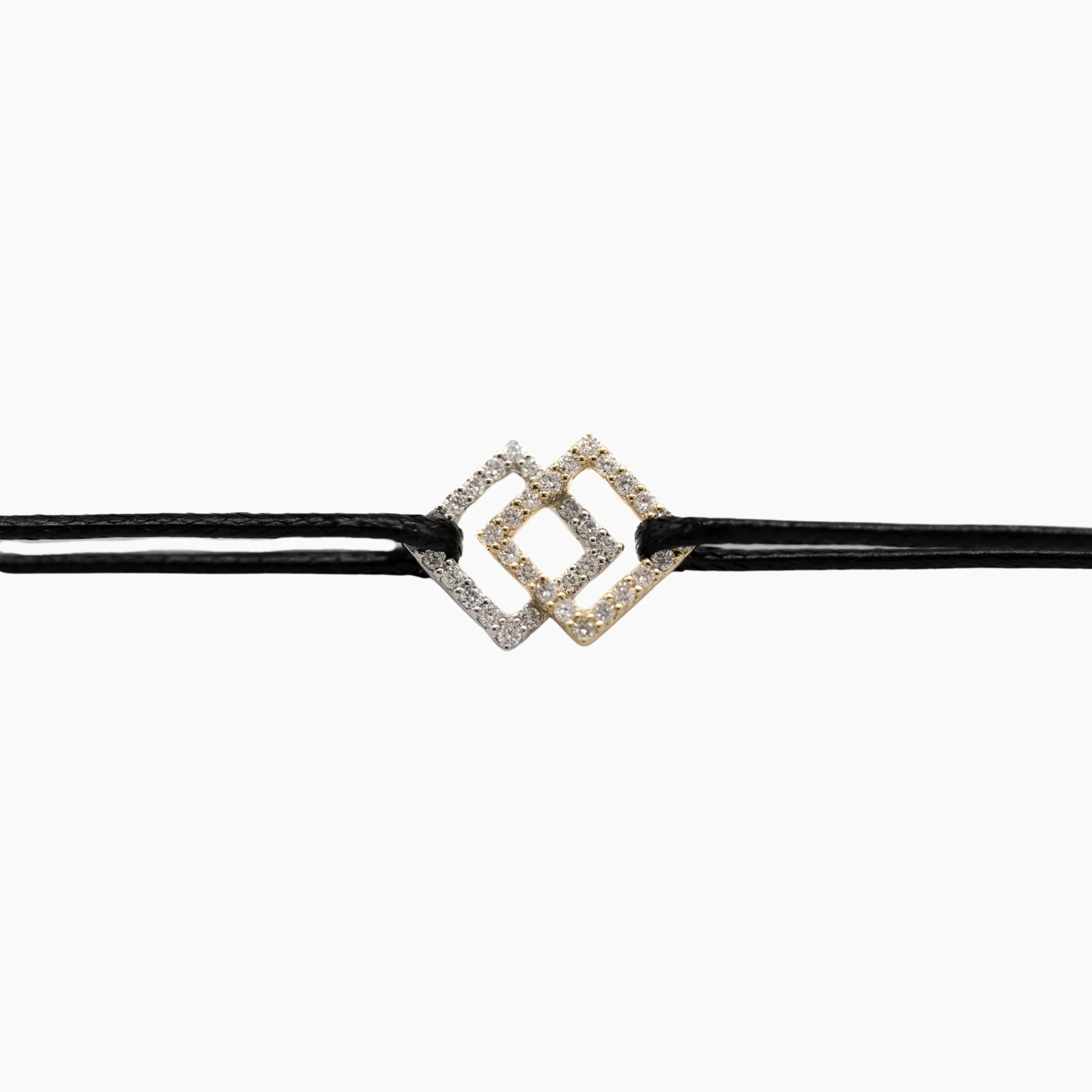 Bracelet sur cordon composé de carrés entrelacés en or bicolore 14 carats et diamants blancs.